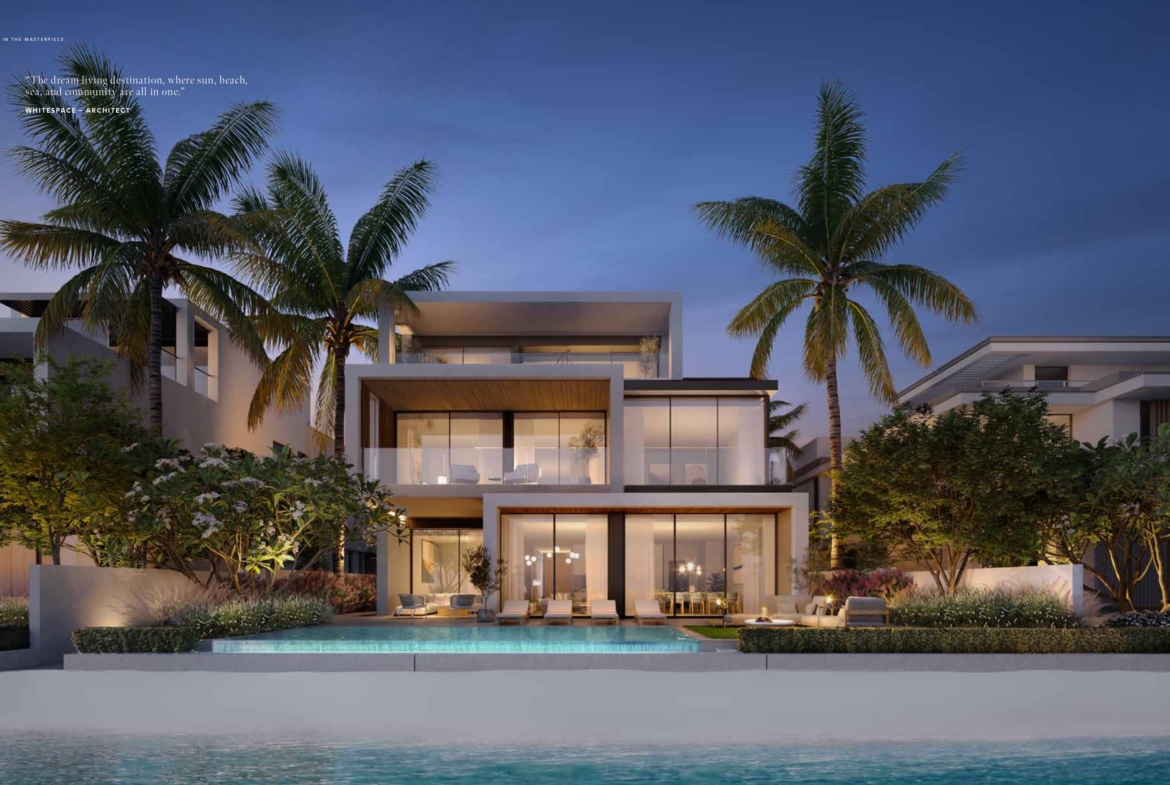 Indigo Ocean Villa at Palm Jebel Ali is a spectacular beachfront home that combines sleek modern architecture with the luxury of a resort. The villa’s layered design, sweeping glass walls, and floor-to-ceiling windows flood the interiors with natural light and showcase uninterrupted views of the ocean. Boasting expansive open-plan spaces, high-end finishes, and multiple outdoor areas, including a breathtaking beachside garden, this residence offers a peaceful coastal escape, ideal for family gatherings, relaxation, and refined seaside living.